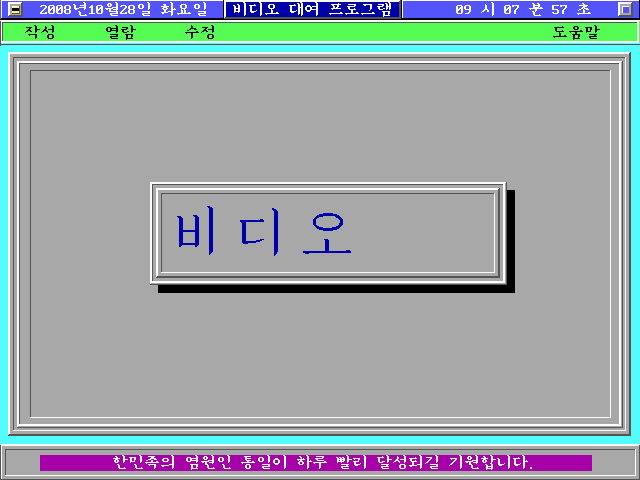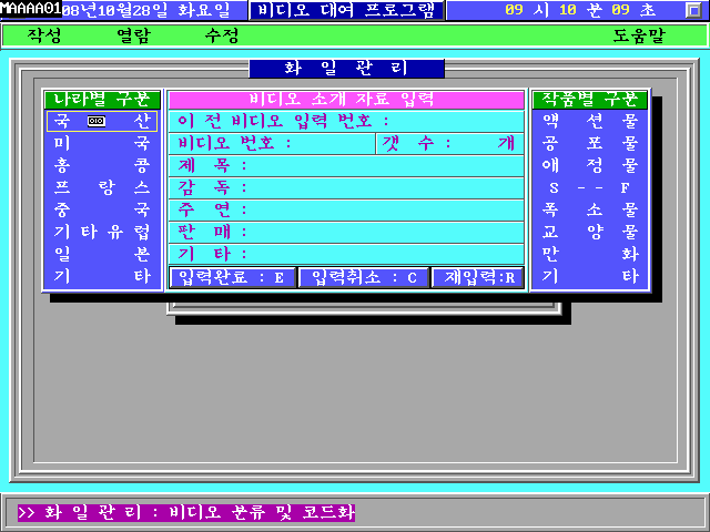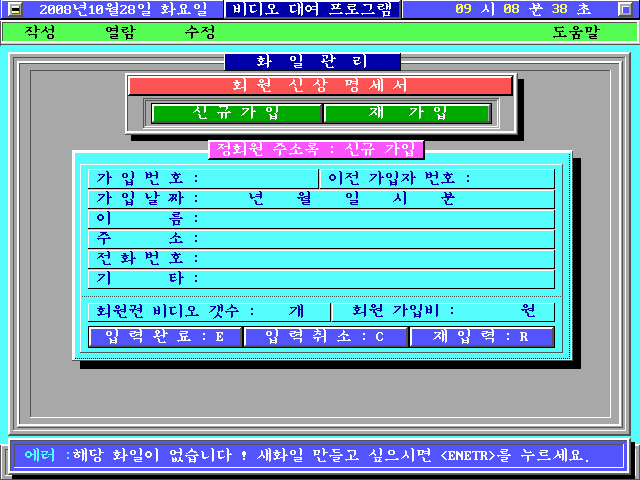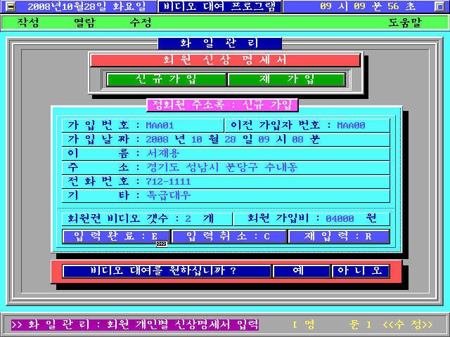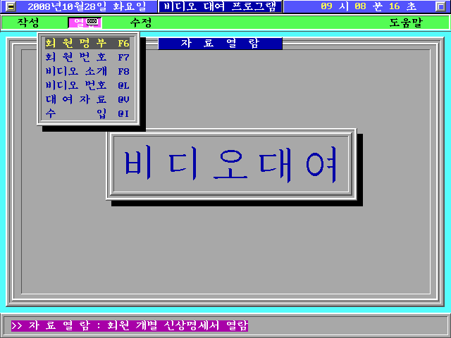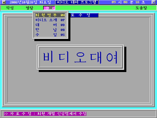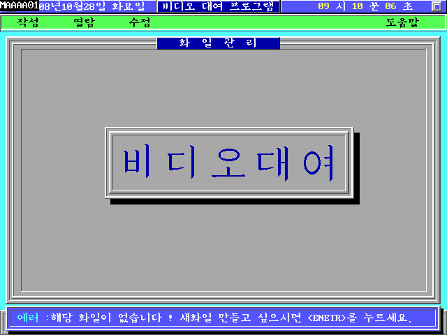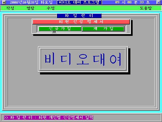 e. 윈도우 가운데 영역에 배경이 채워지면서 비디오 대여 글자가 출력되는 동시에 PC 스피커에 틱~틱 소리가 동시에 출력됩니다. 상단에는 날짜/요일/시간과 프로그램 제목이 출력되며, 그 아래 메뉴가 출력됩니다. 맨 아래는 프로그램 상태 메세지를 출력하는 창입니다.