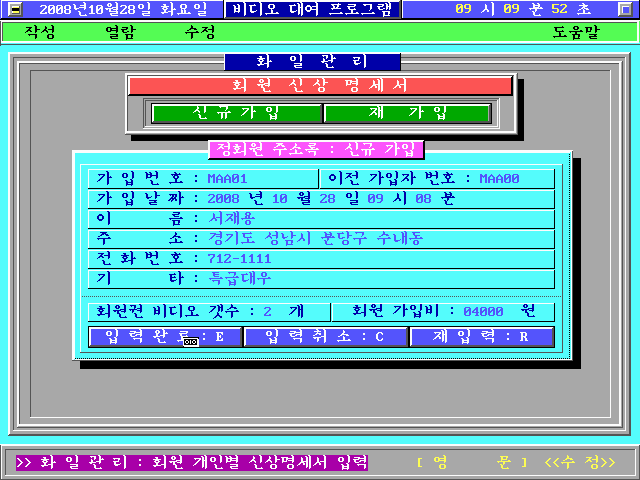 l. 회원정보를 입력합니다. 가입번호는 자동으로 입력됩니다. 그리고 비디오 대여 개수를 입력하면 회원 가입비가 계산되어 출력됩니다. "E"를 누르면 입력이 종료되고, "C"를 누르면 입력이 취소됩니다. ""R을 누르면 다시 입력할 수 있습니다.
