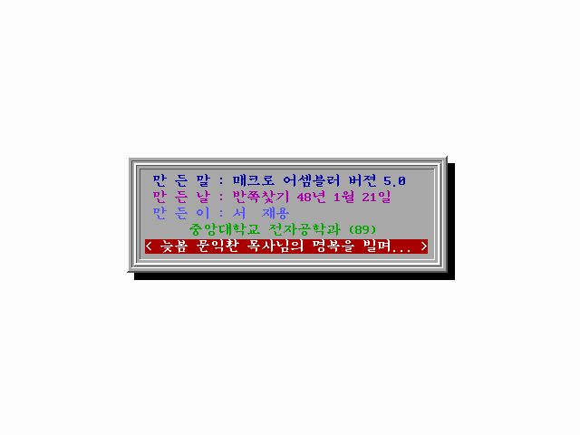 OS는 DOS이고 DOS 그래픽 모드에서 한글, 이미지 출력은 직접 그래픽 카드 메모리를 액세스 했습니다. 그야말로 힘든 과정이였습니다. 그런데 당시의 컴퓨터는 FDD 5.25인치 2개로 부팅하는 환경이였습니다. C도 사용되지 않고 Fortran으로 전산기초 수업을 들었을 때며 저는 GW 베이직이나 Quick-Basic을 사용했었습니다. 그런데 속도가 너무 느려 프로그램이라고 하기도 어려울 정도 였는데 어셈블러로 작업한 결과는 그야말로 엄청난 속도를 보여주었습니다. 실행속도에 매료되어 결국 어셈블러 프로그램을 시작하게 되었습니다.